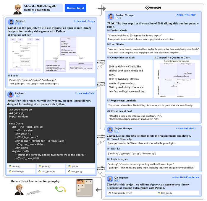 Observe que cada agente interage com outro entregando produtos da sua área de expertise, reproduzindo as etapas de criação do produto, ou seja, são gerados os requisitos do produto, histórias de usuário, uma lista de tarefas, análise de competitividade, código e testes. A equipe trabalha de forma autônoma a partir da ideia original do usuário. Os autores de MetaGPT vão além ao propor uma “AgentStore”, uma plataforma “dedicada a auxiliar usuários na criação e desenvolvimento de agentes dentro do framework […] permitindo que os usuários gerenciem facilmente uma variedade de agentes com diferentes emoções, personalidades e capacidades para tarefas específicas.” Leia aqui o paper do MetaGPT)