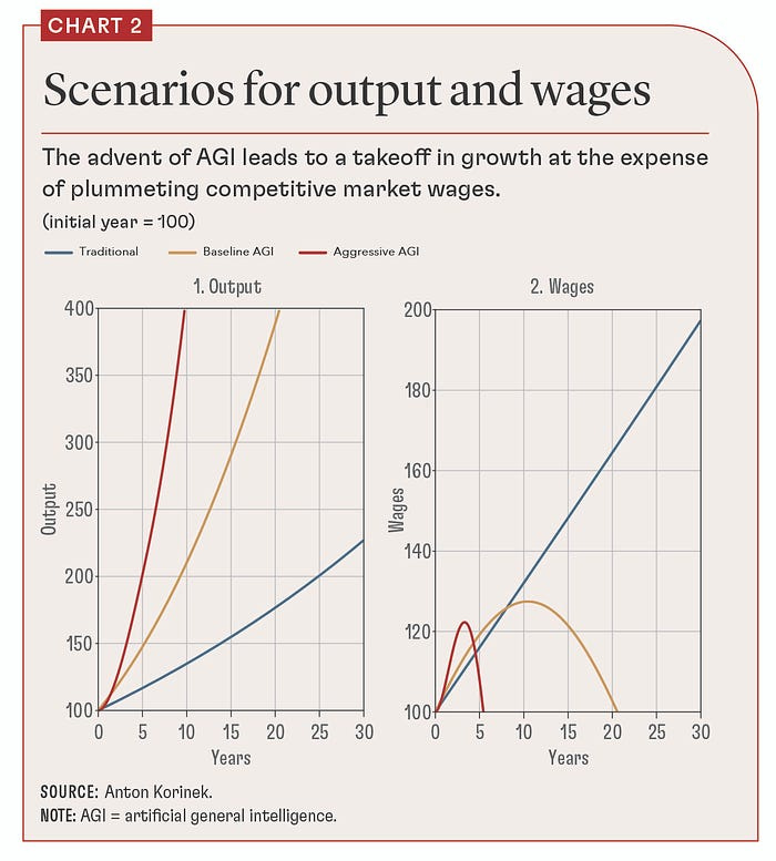 No entanto, esta revolução não está livre de desafios. Integrar estas tecnologias nas rotinas de trabalho requer adaptação e uma nova mentalidade por parte das equipes. Além disso, questões éticas e de privacidade relacionadas ao uso de IA precisam ser tratadas com seriedade. Organizações e governos devem estar atentos a esses aspectos e investir no treinamento de suas equipes e na formulação de políticas para maximizar o potencial dessas tecnologias. Em artigo recente para o FMI, Anton Korinek, professor de economia na Universidade de Virgínia, argumenta que a sociedade precisa se preparar para três cenários tecnológicos possíveis, variando do tradicional “business as usual” até a possibilidade de AGI. Sua análise mostra os efeitos na economia (produtividade e renda) para avanços incrementais na AI, que aumentam a produtividade e criam novas oportunidades de emprego, até o cenário mais agressivo, com a chegada de AGI dentro de cinco anos, o que teria implicações profundas e poderia desvalorizar o trabalho humano. Nos cenários com AGI, a produtividade dispara mas os salários despencam.