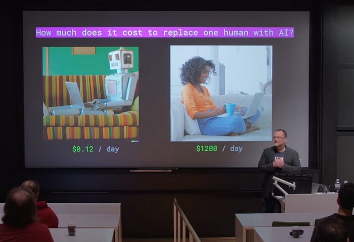Agentes de IA autônomos devem revolucionar a forma como os projetos são desenvolvidos e gerenciados. Ao automatizar a geração de código e outras tarefas de desenvolvimento, reduz-se significativamente o tempo e o esforço necessários para levar um projeto do conceito à conclusão. Isso representa uma mudança fundamental na economia do desenvolvimento de software, como destacado por Matt Welsh, que já trabalhou no Google, Apple, lecionou em Harvard e hoje toca sua própria startup em IA, a Fixie. Em aula recente no curso de Ciência da Computação em Harvard, Welsh fez uma análise sobre o custo de um engenheiro de software em comparação com uma IA. Ele argumenta que, enquanto um engenheiro é um recurso valioso e caro, a IA pode oferecer uma alternativa de custo mais baixo e eficiência potencialmente maior. Em seus cálculos, enquanto um desenvolvedor custa, em média, $1200 por dia, uma IA que entregue a mesma quantidade de código válido custa apenas $ 0,12/dia, um fator de 10.000, levando em conta os preços da API da OpenAI em Outubro/23 (que já baixaram de lá pra cá). Ainda que sejam números estimados, a ordem de grandeza é brutal.