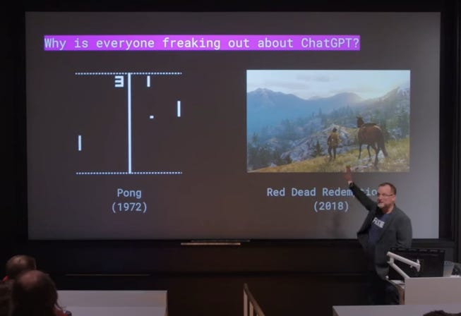 2023 foi o ano de explosão da IA, com o desempenho impressionante dos modelos da OpenAI e a competição emergente dos modelos de código aberto como o Llama 2 e o Mistral. Foi um ano de provas de conceito e desenvolvimento de infraestrutura. Em 2024 veremos estas inovações sendo aplicadas ou se transformando em produtos e impactando diversas indústrias. E o desenvolvimento não vai parar. Matt Welsh fez uma analogia interessante em sua aula em Harvard: para quem não estivesse acompanhando os avanços de modelos generativos, as inovações recentes deram a impressão de que a IA passou de algo sem graça para algo incrível da noite pro dia, como se tivéssemos passado do jogo Pong para Red Dead Redemption 2 em apenas 3 meses.