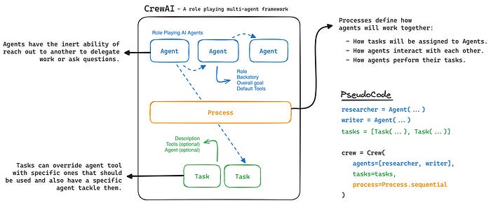 Framework mais recente desenvolvido pelo brasileiro João Moura, o CrewAI tem a flexibilidade do Autogen e se diferencia do mesmo por ter sido concebido do início voltado para processos e ambiente de produção. Outra característica da ferramenta é a capacidade dos agentes de delegarem tarefas entre si.